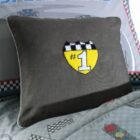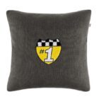 Almofada 45cm x 45cm cinza com escudo bordado em amarelo e preto, trazendo o símbolo “#1” em estilo esportivo.