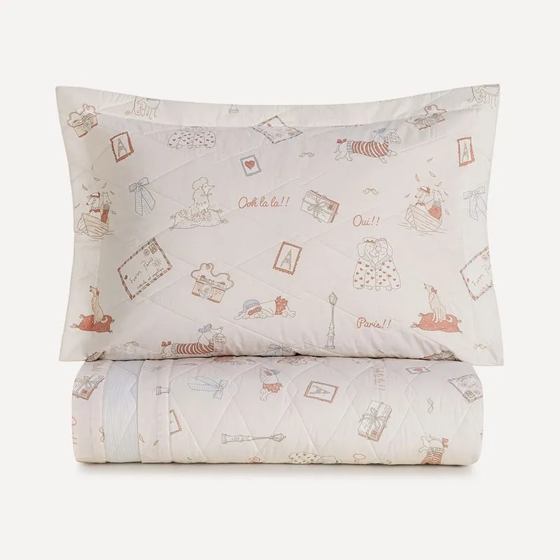 A colcha Jolie é dupla face e proporciona versatilidade à decoração. Na frente, a estampa apresenta os cachorrinhos em clima parisiense; no verso, padronagem listrada em azul. O porta-travesseiro acompanha a mesma proposta e completa o conjunto com charme e sofisticação. A peça conta com acabamento cuidadoso e enchimento leve, ideal para composições que unem conforto e delicadeza. Uma escolha encantadora para quartos infantis com toques românticos e divertidos.