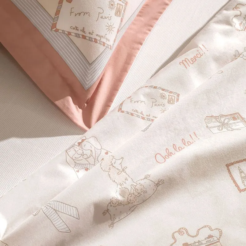 Descrição Visual: Fundo rosa claro com ilustrações sutis de cachorrinhos, laços, postais e elementos de paris em tons rosados.